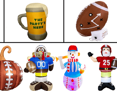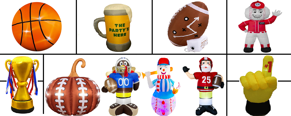 shown above (ALL plug in inflatables): Basketball 7ft, Beer Mug 4ft H, strategy Football 3.9 ft H x 6 ft W, Baseball Guy (wearing generic vest) 7 ft H; (row 2): streamers Trophy 6.5 ft H, Pumpkin football 4.6 H x 4.6 W, Turkey Football Player 8 ft H, Snowman Baseball Player 6 ft H, African-American Santa Football Player 8 ft H, yellow #1 Hand 6 ft H x 3.5 ft W.